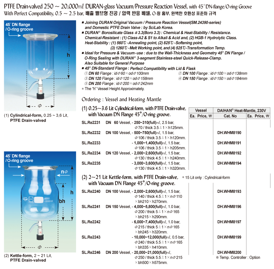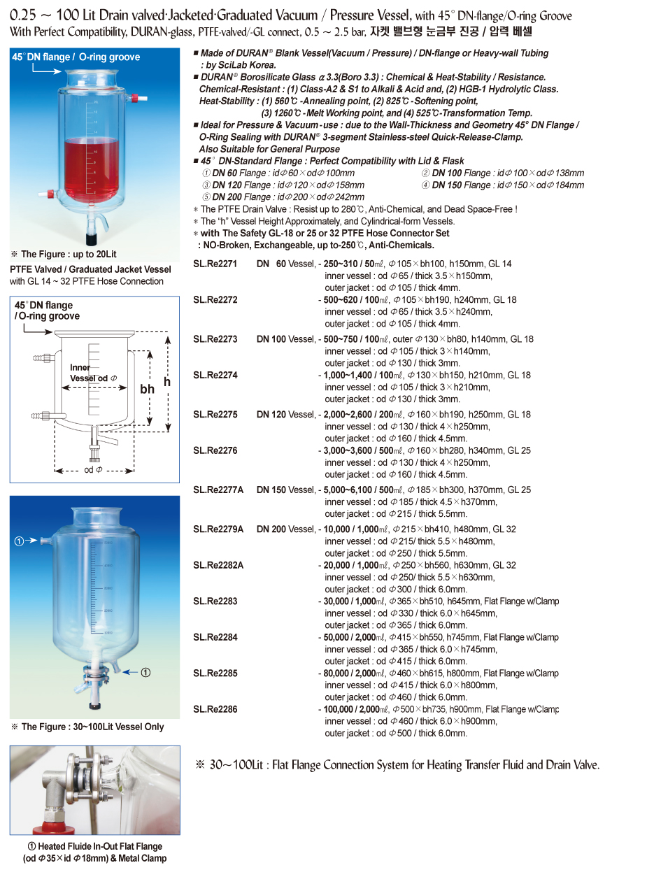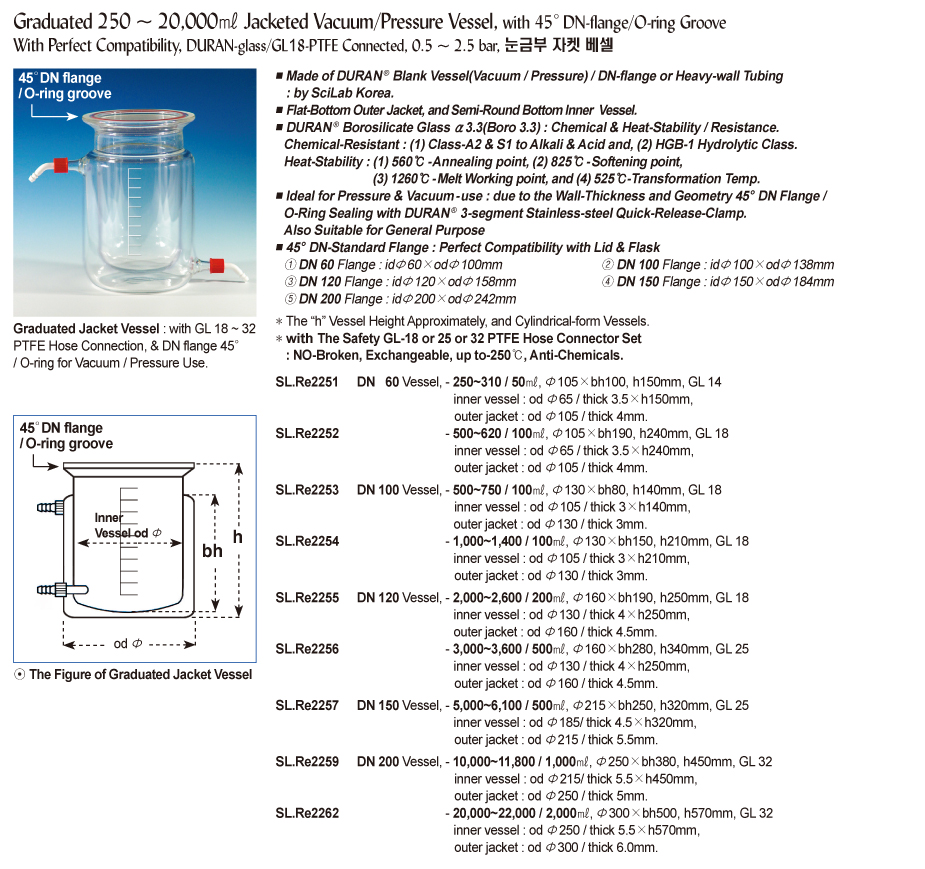 Bình phản ứng chịu áp suất, chân không được làm bằng thủy tinh Duran dày 5mm với đặc tính vật lý, hóa học rất tốt