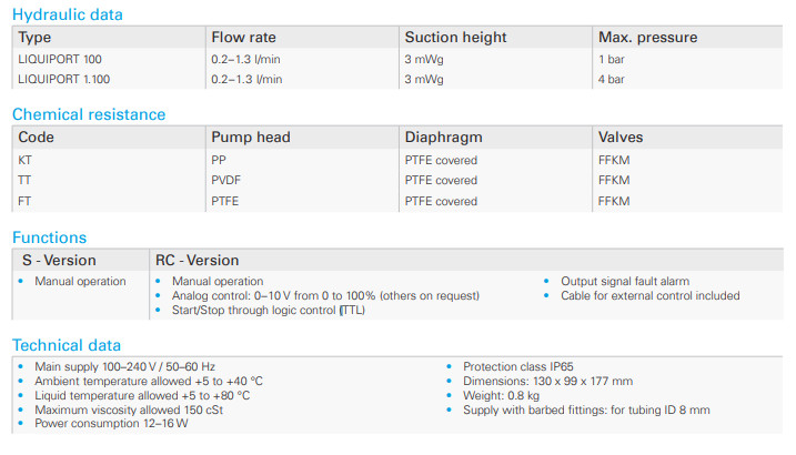 Các chất lỏng mang đặc tính khác nhau đều có thể sử dụng, tùy chọn chất liệu cho đầu bơm (PP, PVDF, PTFE), màng và van