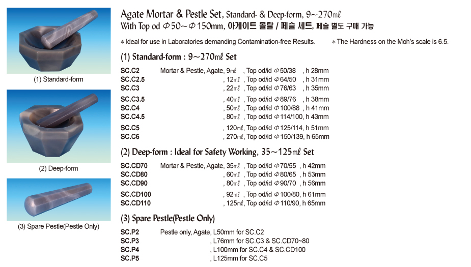 Agate Mortar & Pestle Set, Standard- & Deep-form, 9~270㎖With Top od Φ50~Φ150mm