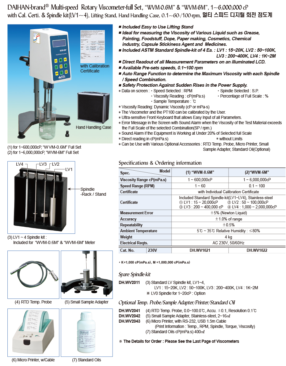 * Bao gồm bộ kít 4 đầu khuấy bằng thép không gỉ (Spindle kit) LV1~4: LV1: 15~20,000; LV2: 50~100,000; LV3: 200~400,000; LV4: 1,000~2,000,000 cP theo tiêu chuẩn ASTM