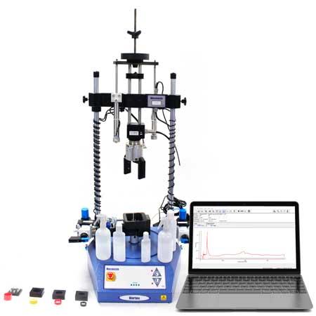 Sau đó, Thiết bị kiểm tra mô-men xoắn tự động Mecmesin sẽ quay để thực hiện kiểm tra mô-men xoắn theo yêu cầu của phương pháp tiêu chuẩn phù hợp: nhấn xuống và vặn khớp nối, đẩy và xoay, đảo ngược bánh cóc.