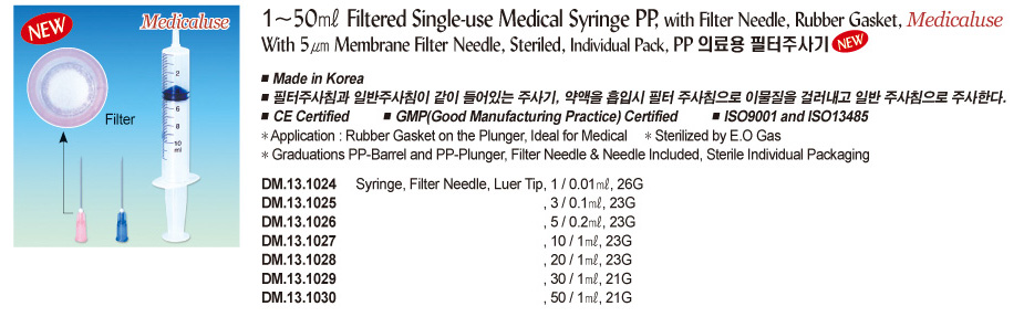 | DM.13.1024 | Syringe, Filter Needle, Luer Tip, 1/0.01ml, 18G, PP의료용 필터주사기 | 100/Pk. |